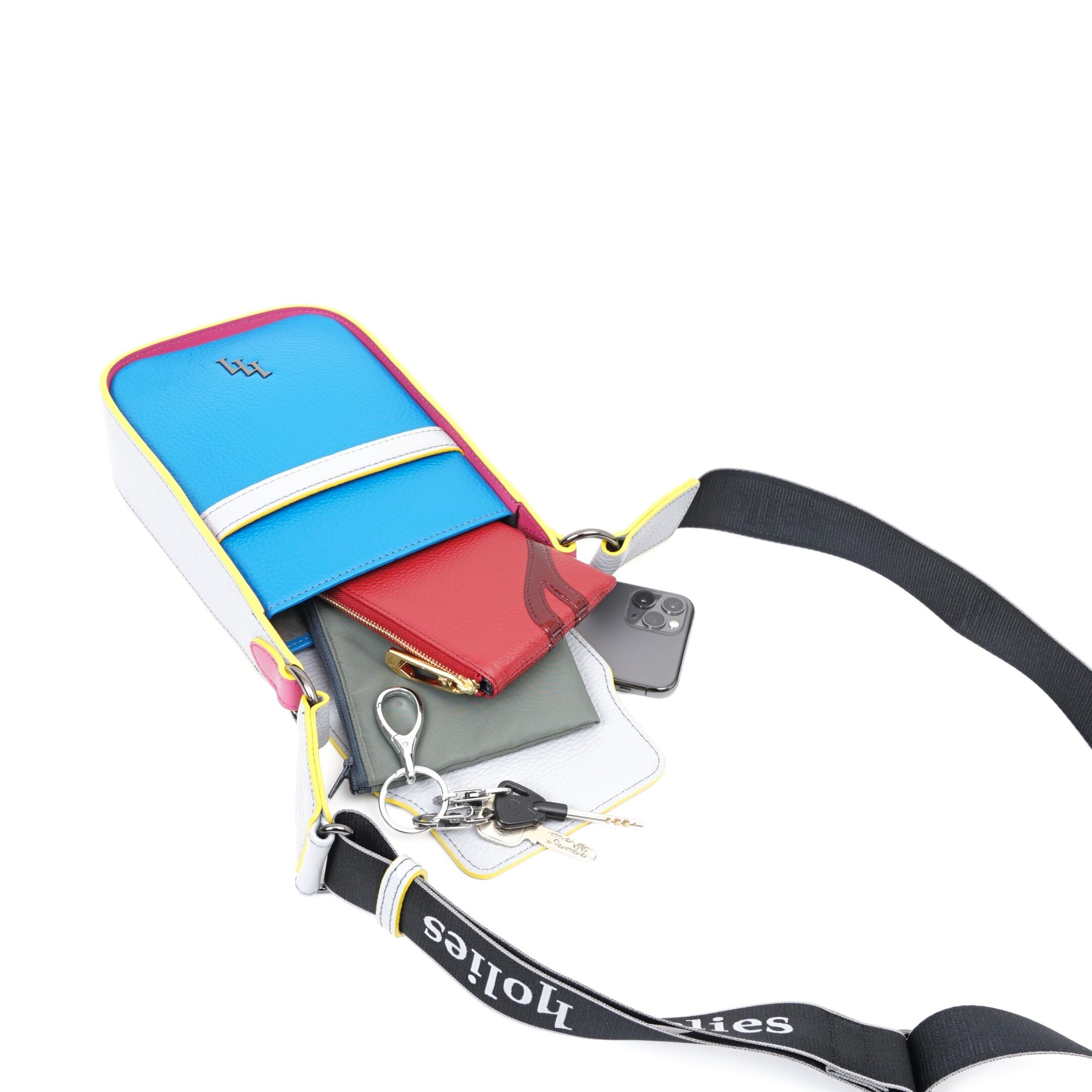 このバッグは、上品さと個性を兼ね備えたブルー、ピンク、グレー、イエローの絶妙なカラーバランスが魅力。