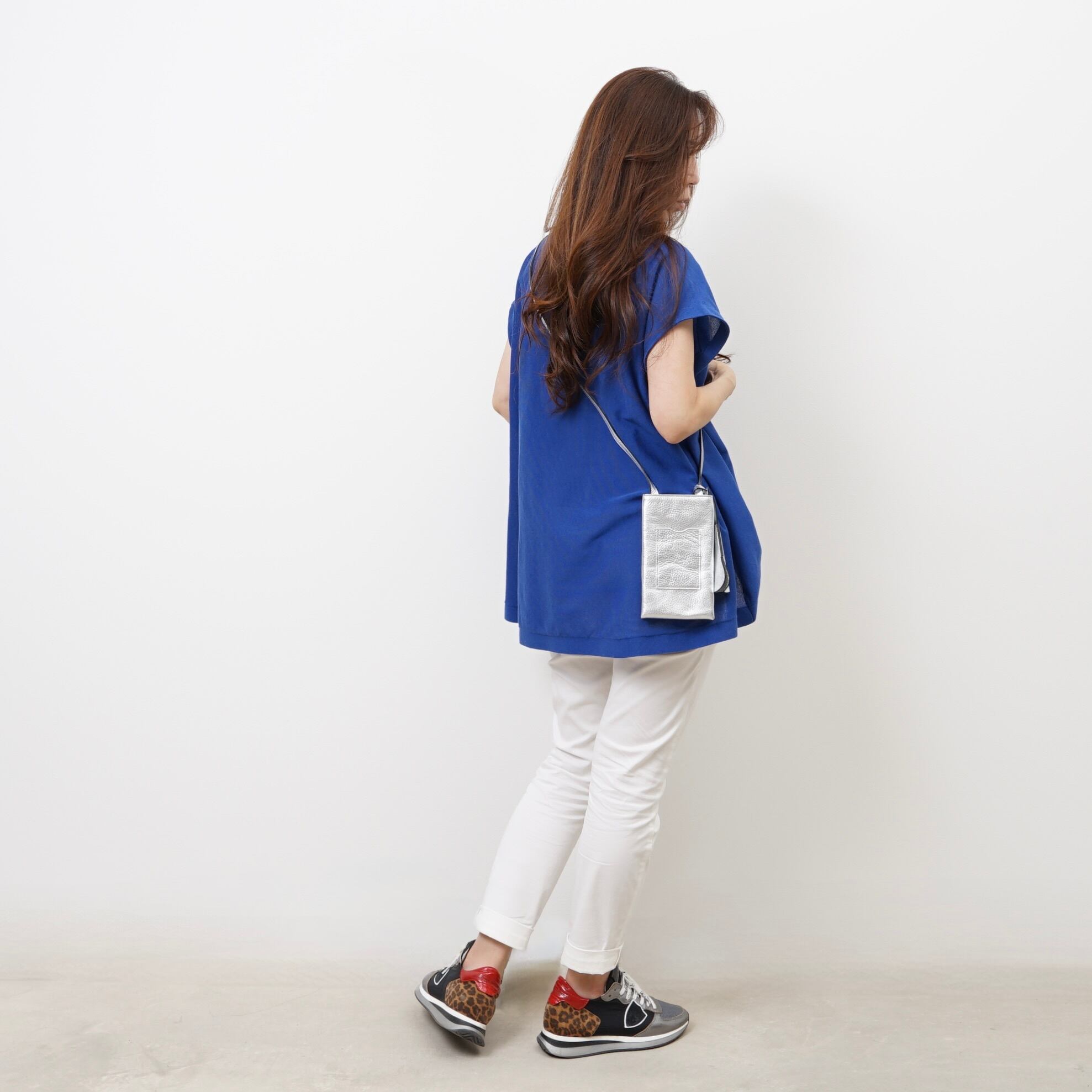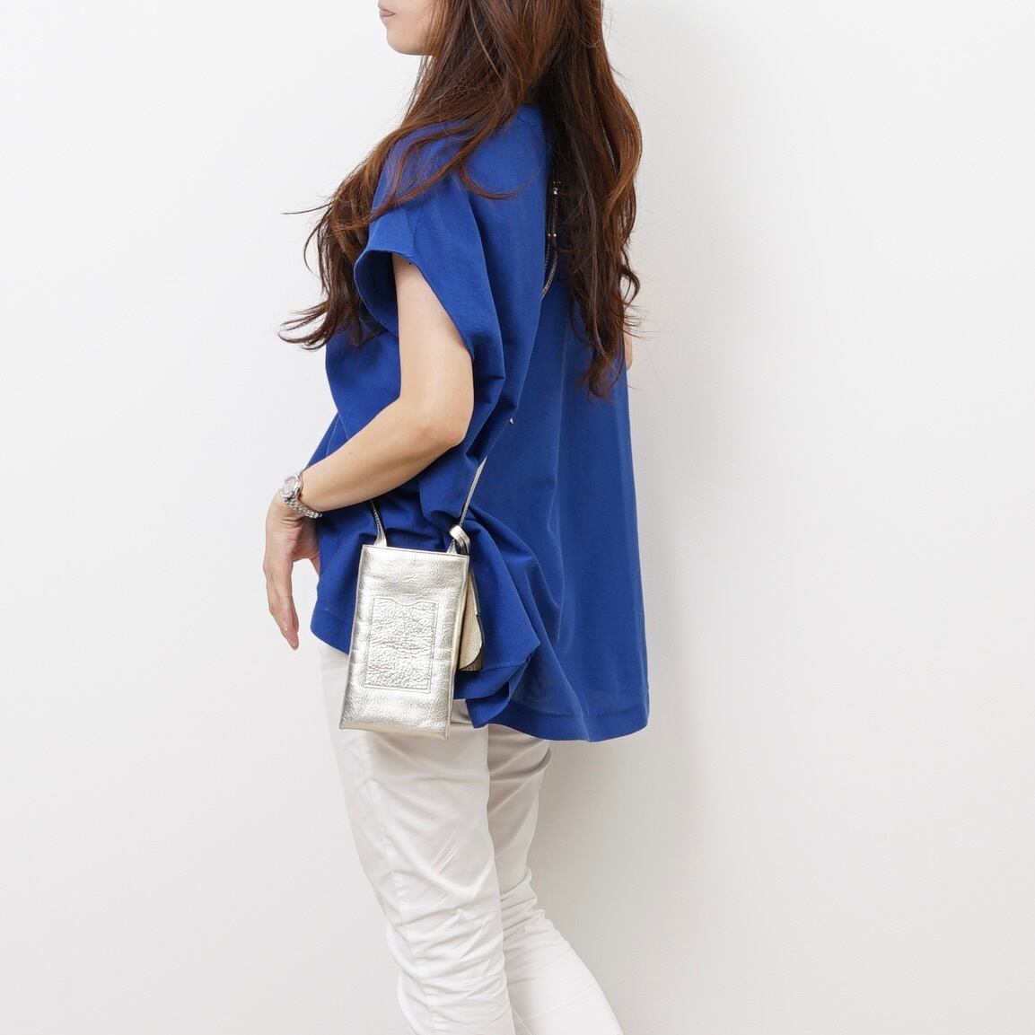 外出に必要なスマートフォンなどのモバイルウエアとカードを快適に携帯できる、キャッシュレス時代のミニマルウエアです。2層式で整理しやすく取り出しもスムーズです。横幅約115mm(外装)で、iPhone13をケース付きで収納可能。パスポートもぴったり収まります。外装は素材感を楽しんでいただけるイタリア製の弱シボ加工牛革を使用。内装はスムーズに出し入れできるシャンタン織のレーヨンを使用しています。