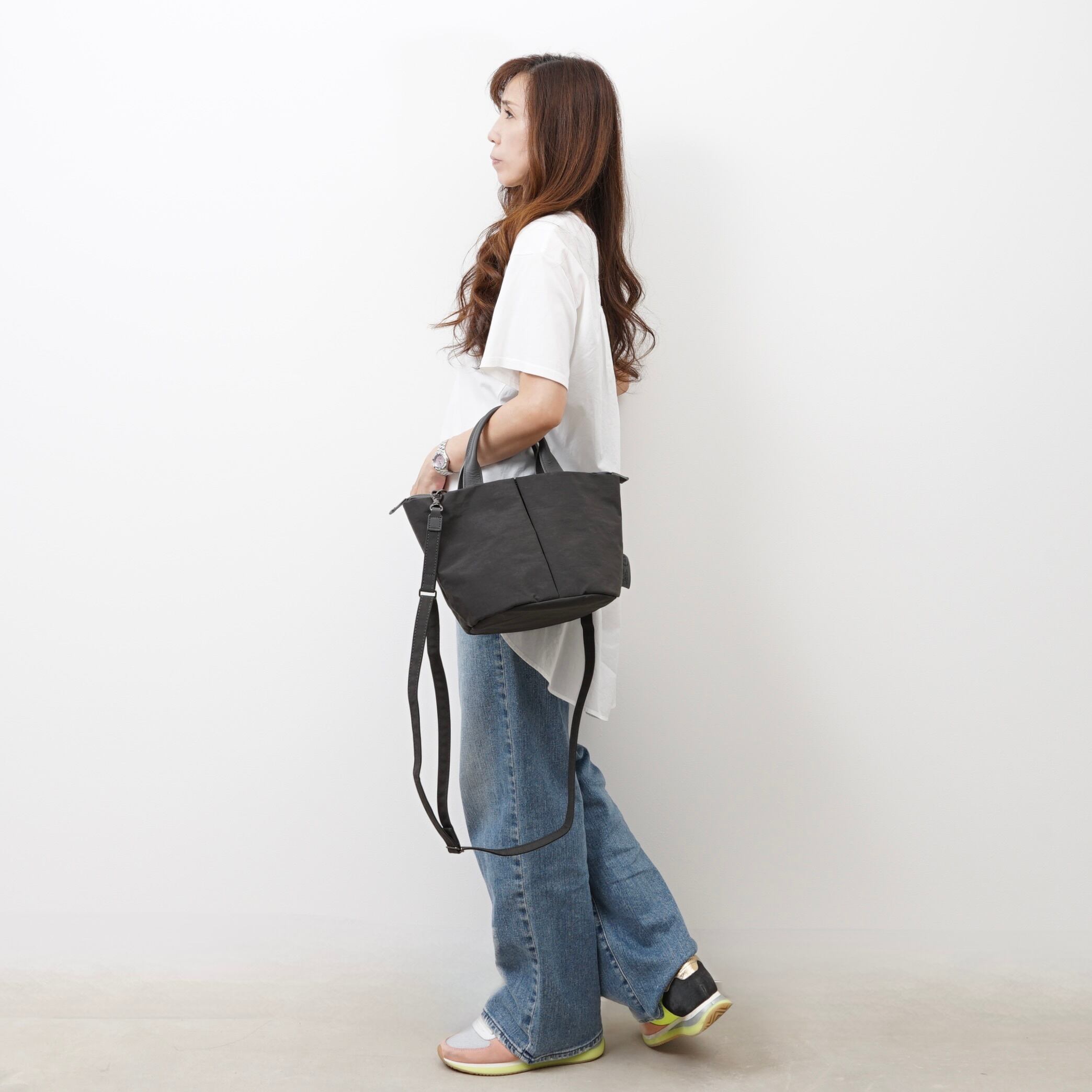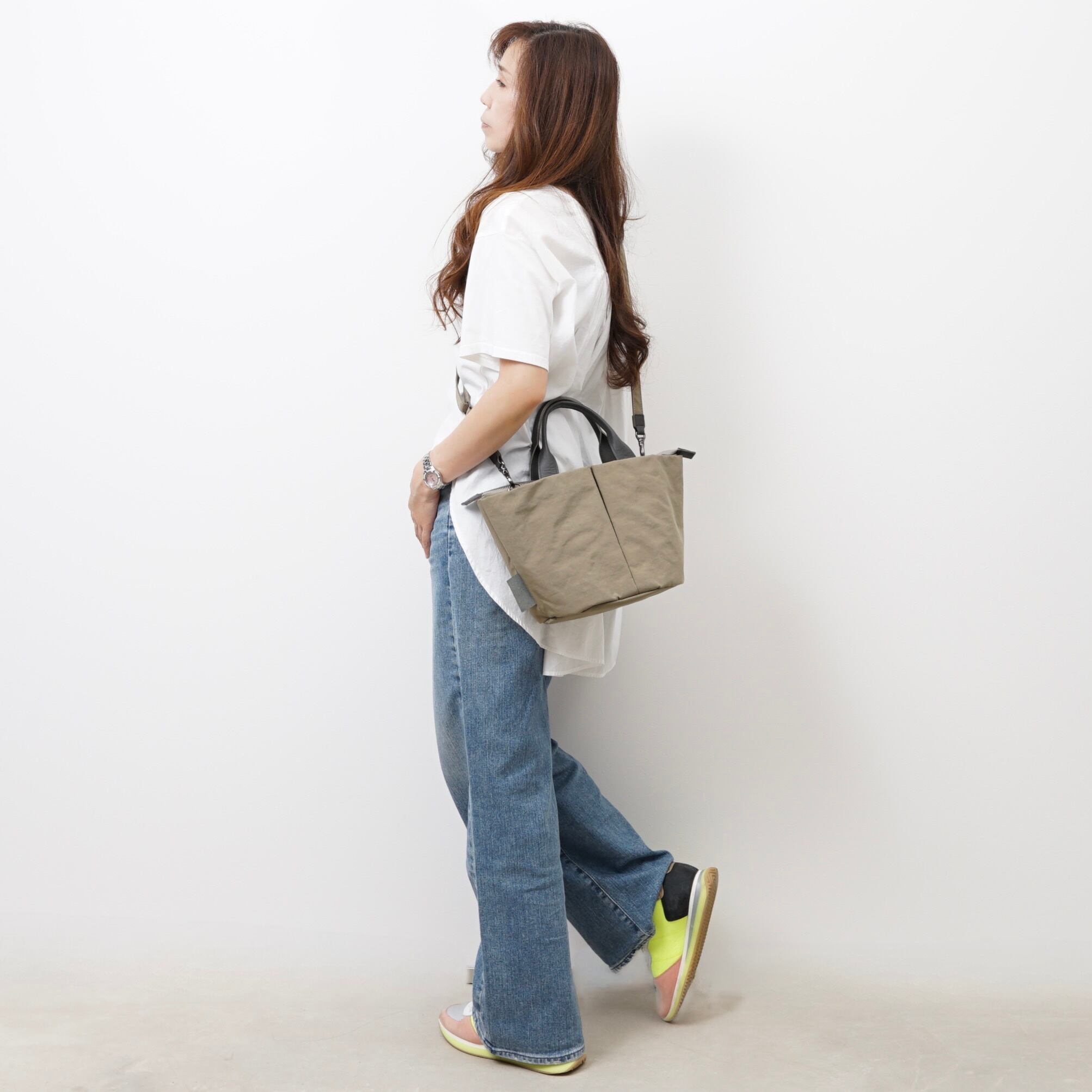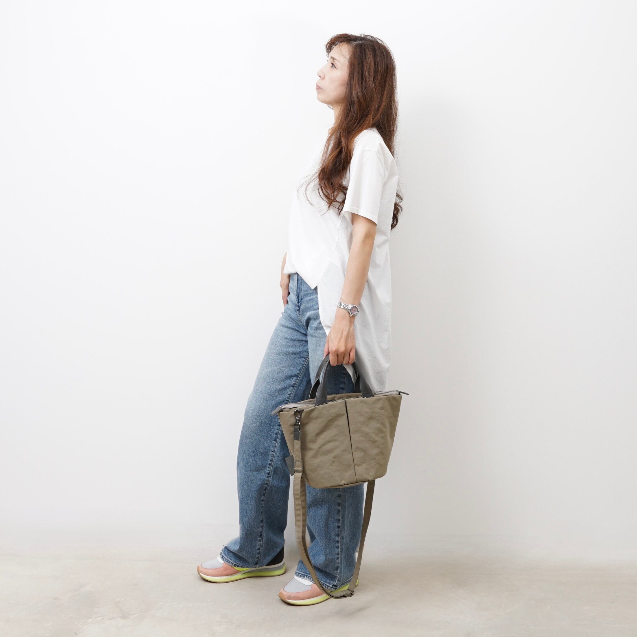本体には特別な 塩縮加工 を施したナイロン素材を採用。繊維を縮めることで生まれる、帆布のようなドライタッチな風合いが特徴です。ナイロンならではの軽量性と耐久性を持ち、弱撥水加工で雨の日も安心。さらに、付属の天然皮革は顔料仕上げで、色落ちしにくく長く愛用いただけます。