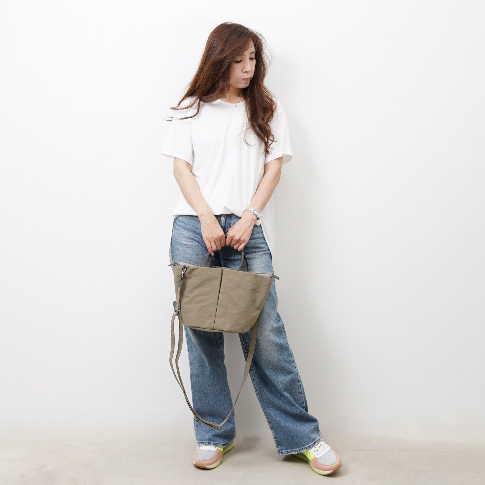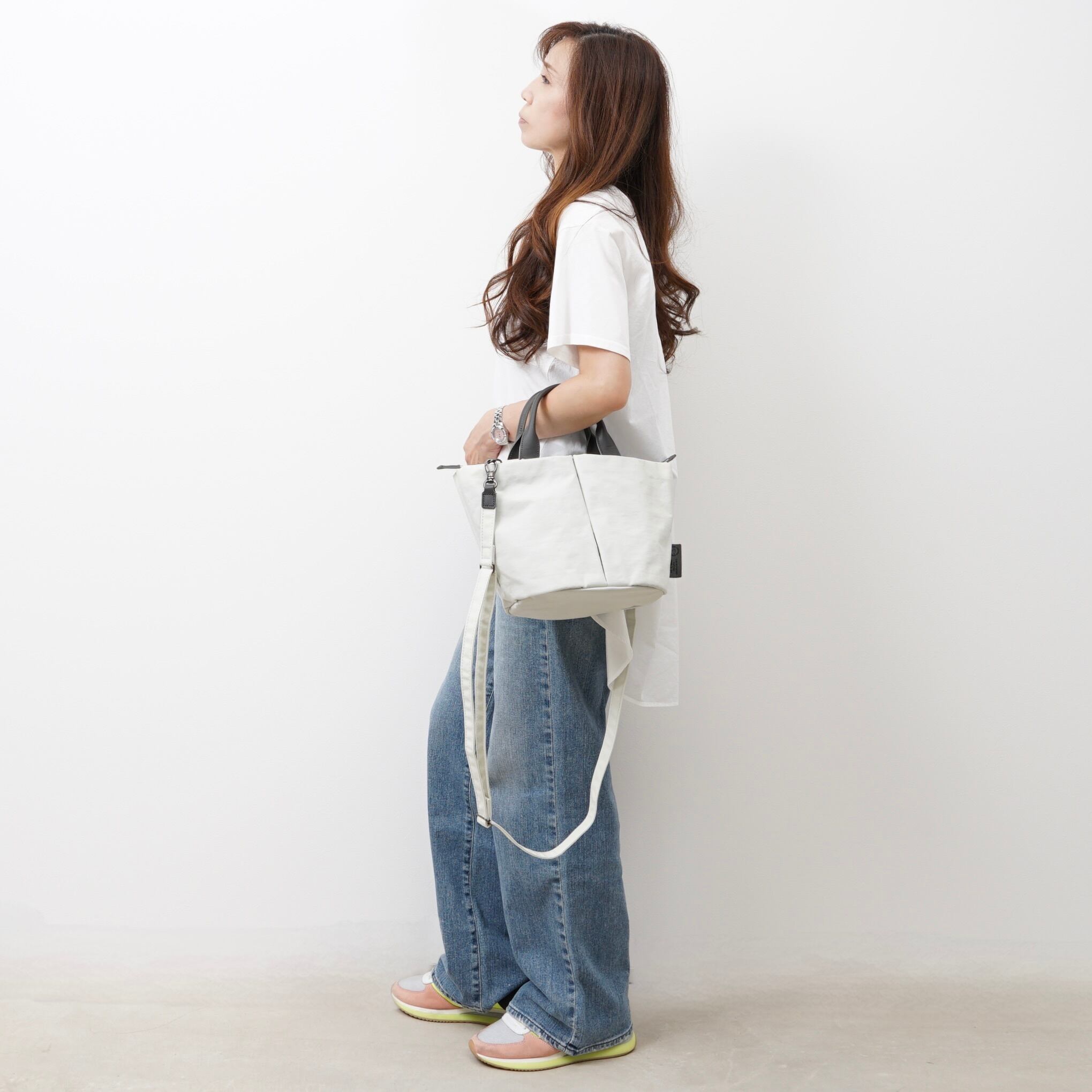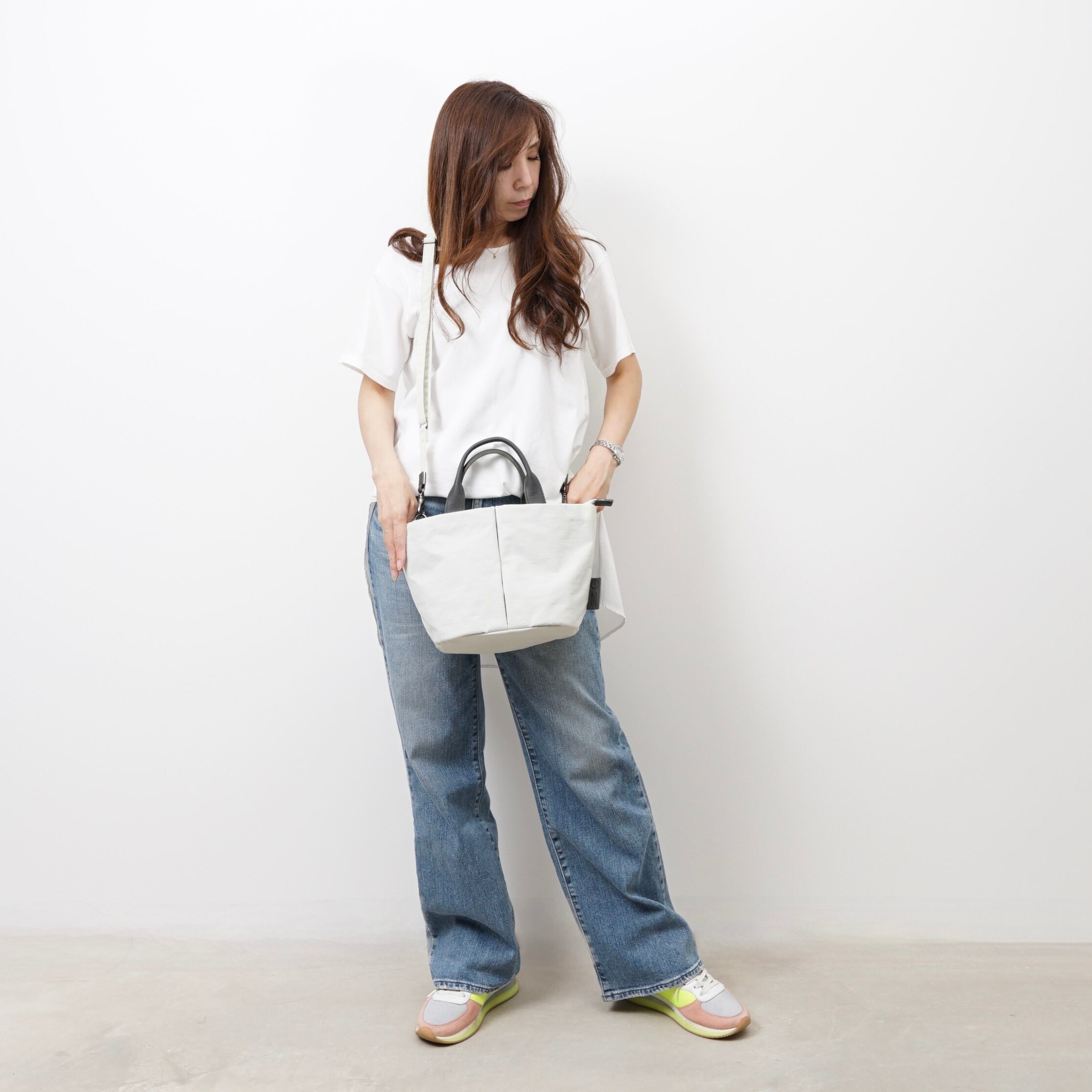 本体には特別な 塩縮加工 を施したナイロン素材を採用。繊維を縮めることで生まれる、帆布のようなドライタッチな風合いが特徴です。ナイロンならではの軽量性と耐久性を持ち、弱撥水加工で雨の日も安心。さらに、付属の天然皮革は顔料仕上げで、色落ちしにくく長く愛用いただけます。