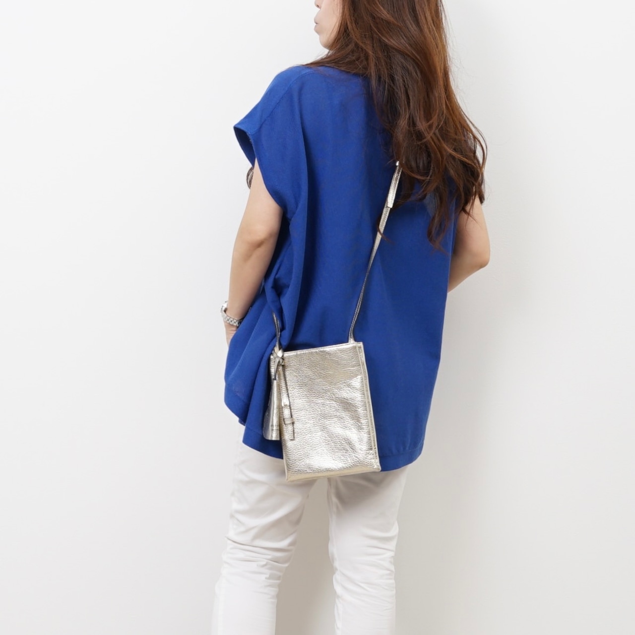 快適に美しく、旅するように毎日を過ごすためのウエアとしてデザインされた、必要最小限のアイテムをスマートに携帯できるミニマルウエアです。2層式のポーチで、iPadmini等もすっぽり収まる収納力です。2層に分かれ整理整頓がしやすく取り出しやすい仕様で、使い勝手も抜群です。貴重品を収めるファスナーポケットもついています。外装は素材感を楽しんでいただけるようにイタリア製の弱シボ加工牛革を使用。内装はシャンタン織のレーヨンを使用しています。